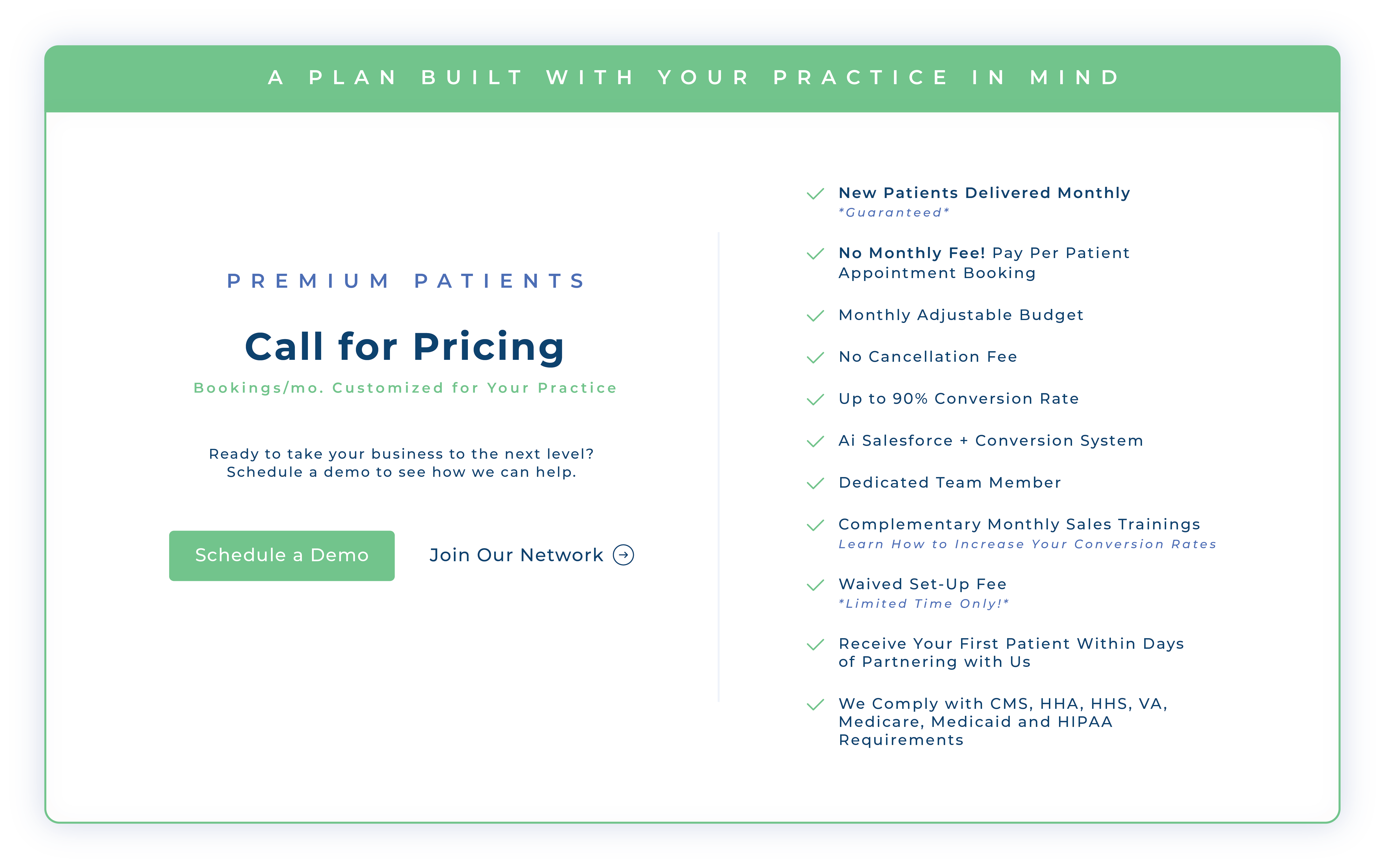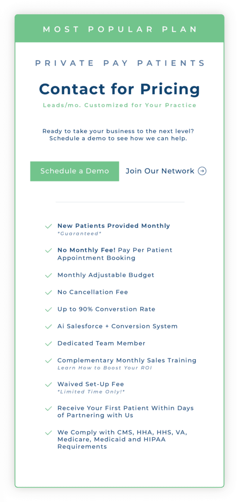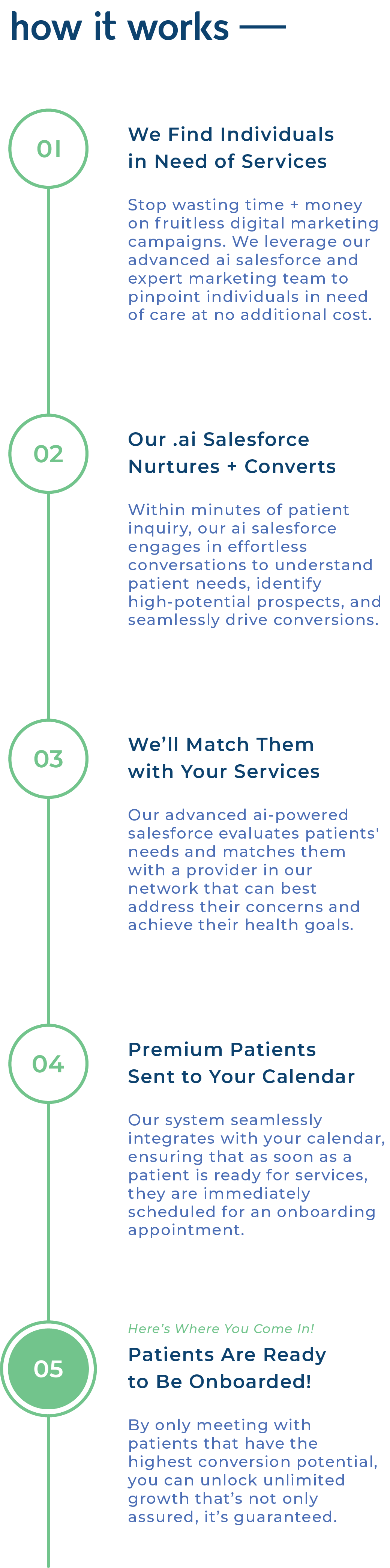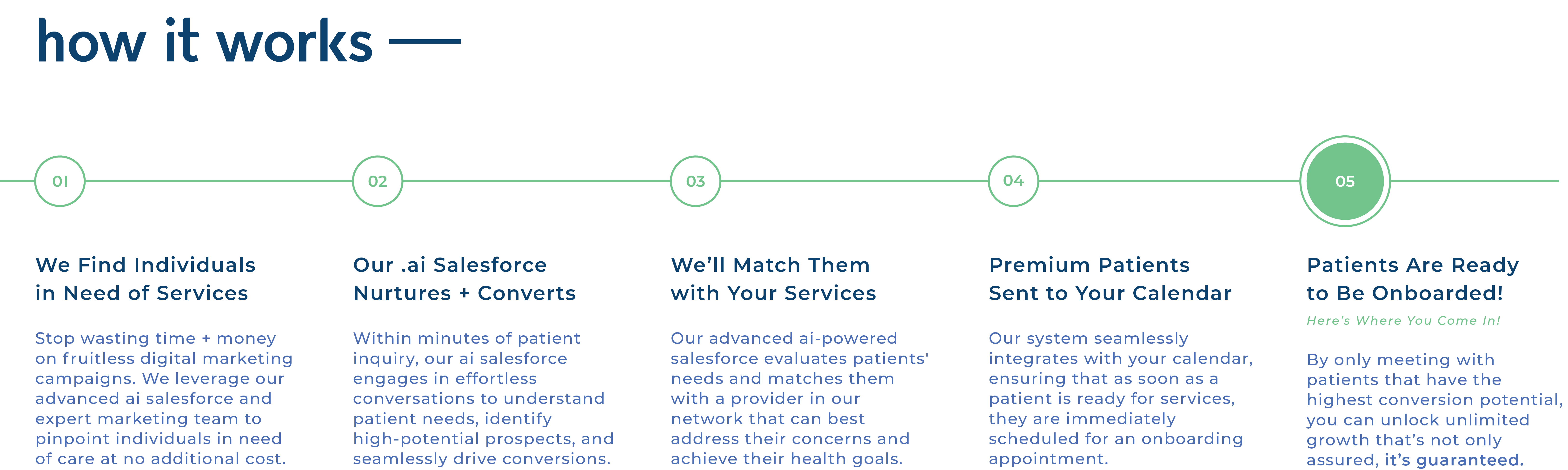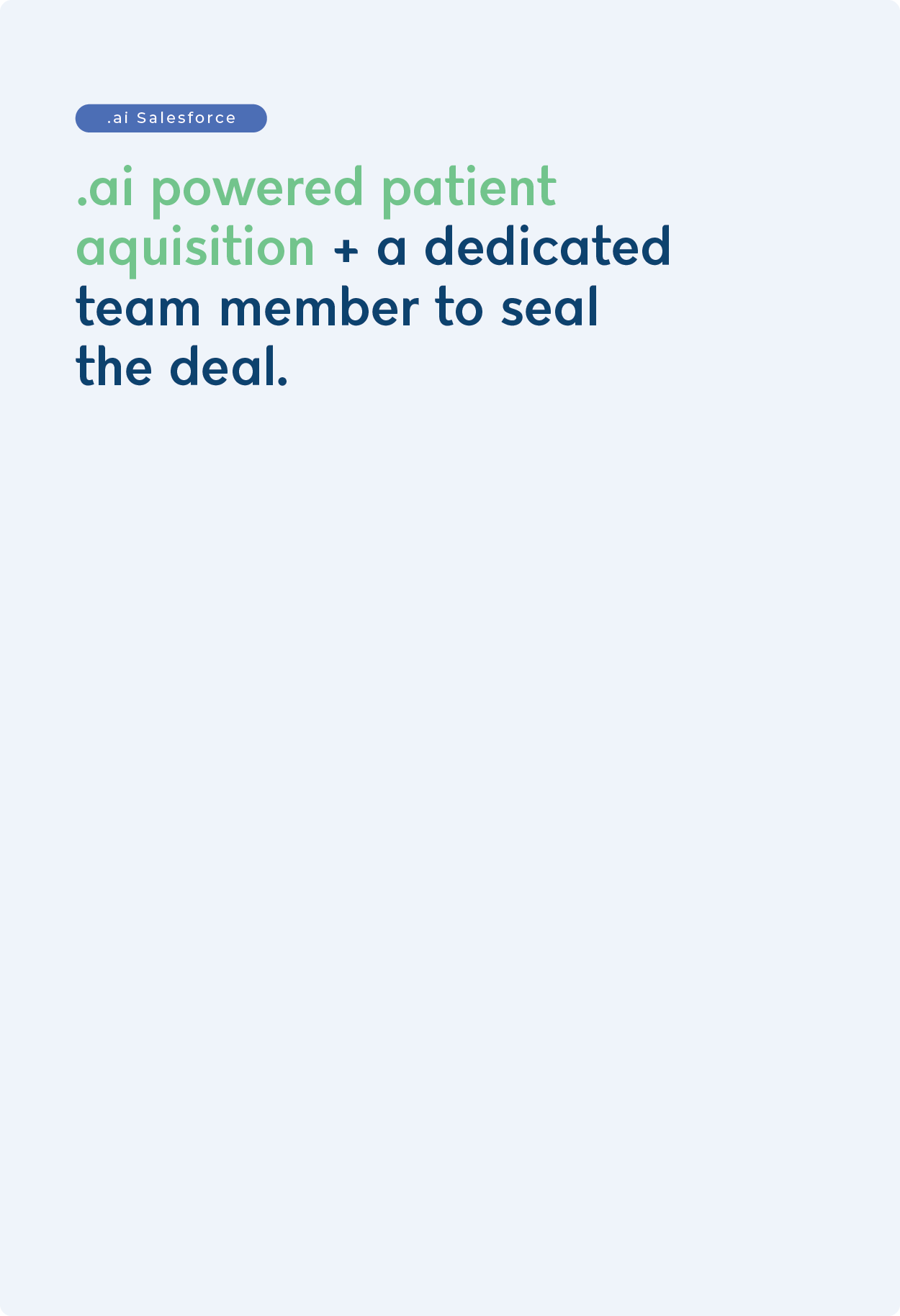 Quit spending time and resources chasing leads—our expert team and AI-powered Salesforce will provide high-intent patients straight to your calendar ready for onboarding.