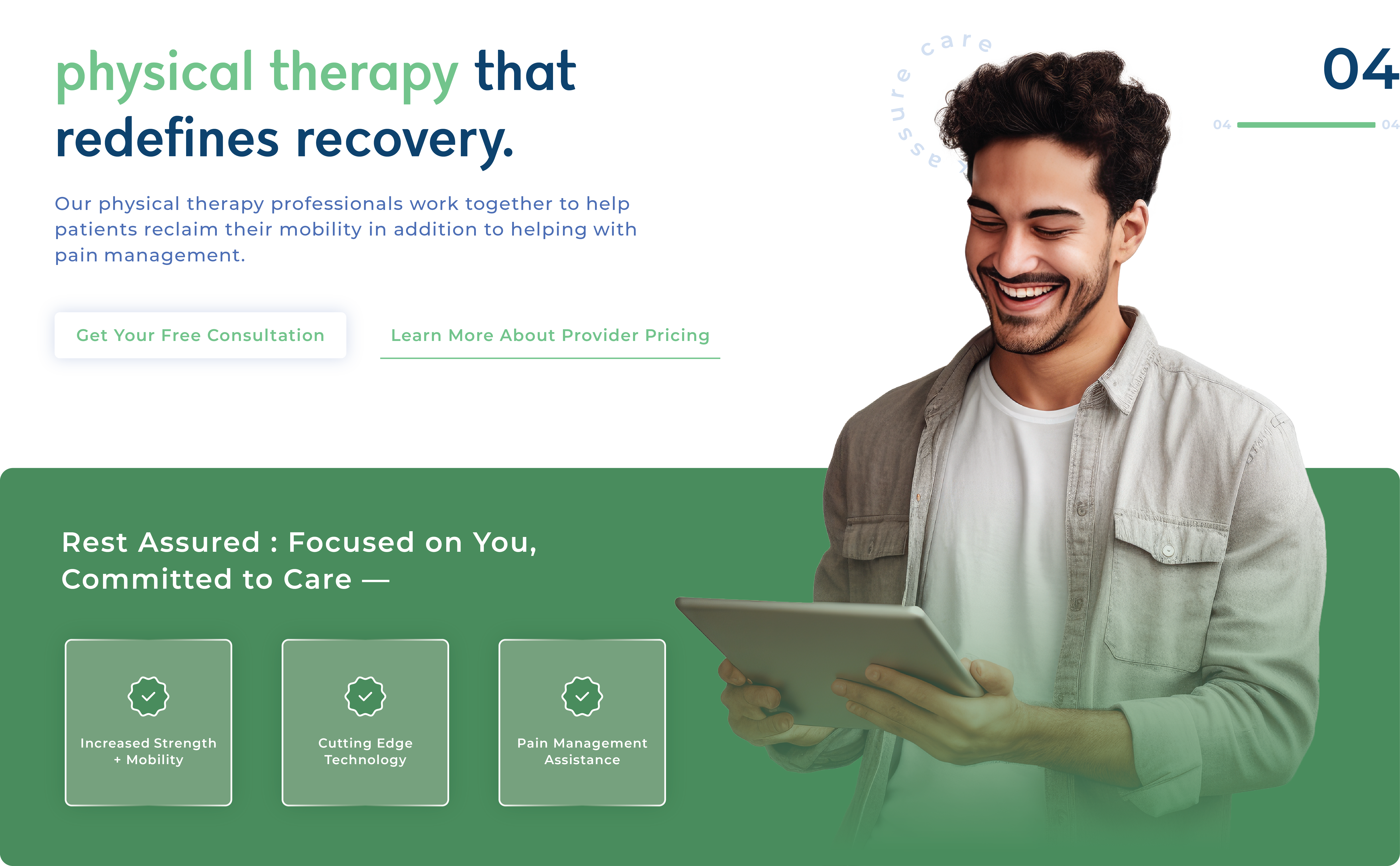 Physical therapy focuses on improving movement, reducing pain, and increasing physical function through various treatments and exercises. Common types of care provided in physical therapy include occupational therapy, speech therapy, and many other specialty rehabilitation programs. During your PT session, you can expect :